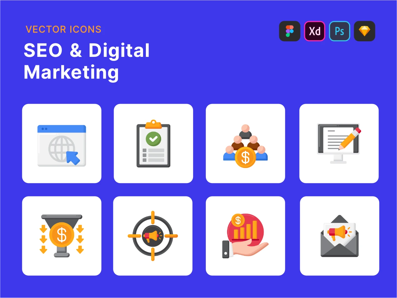 SEO Icon Vector adalah sebuah produk desain vektor yang dirancang khusus untuk aplikasi Sketch, XD, Adobe Photoshop, Adobe Illustrator, dan Figma. Produk ini memudahkan Anda untuk membuat desain yang berkaitan dengan bisnis atau startup dengan mudah dan cepat.